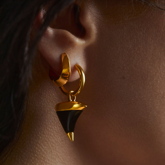 The onyx thorn charm echoes the soul of the collection — a symbol of deep grounding, strength, and quiet resilience. Black onyx is often honoured as a protective stone, believed to absorb negative energy and promote inner balance. Suspended from the hoop, the thorn shape mirrors nature’s defence, reminding the wearer that beauty and protection can rise from darkness.