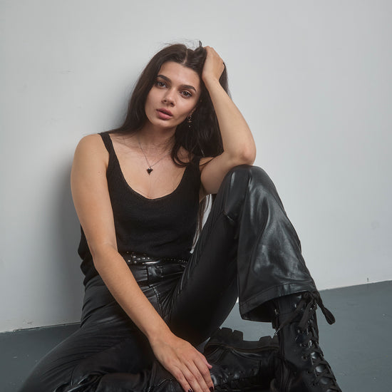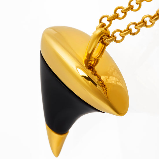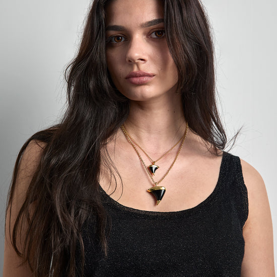 The Midnight Thorn Small Pendant features a sleek black onyx pendant sculpted into a thorn, set in 18ct gold vermeil or rhodium-plated sterling silver, on a 16-inch belcher chain. A refined piece that radiates strength and grounding.