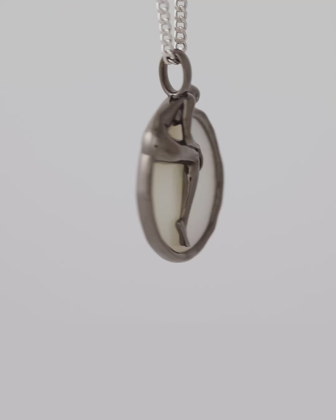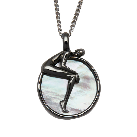 The Soul of the Moon Pendant is a celestial necklace featuring a mother of pearl moon overlaid with a black rhodium-plated sterling silver woman, suspended from a rhodium-plated curb chain. A symbolic design that embodies serenity, balance, and emotional clarity.