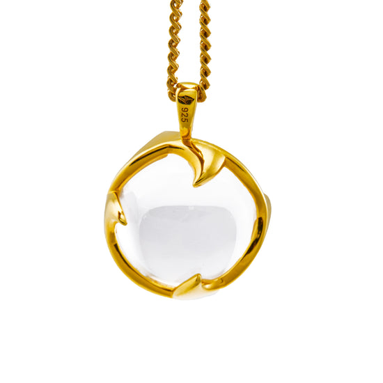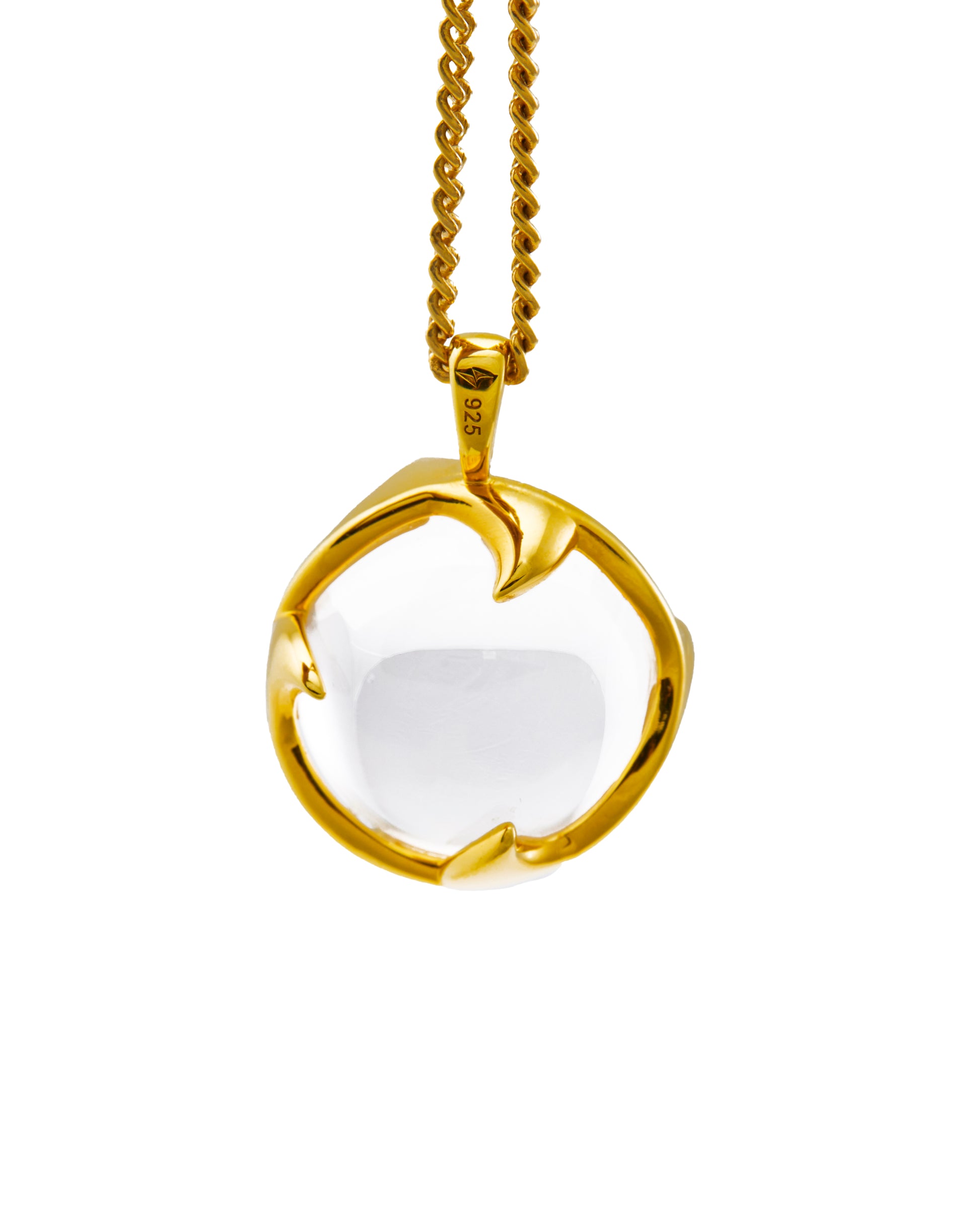 The Wild Moon Necklace features a spinning clear quartz sphere encased in sculpted thorns, crafted in 18ct gold vermeil or rhodium-plated sterling silver. A symbolic lunar design that embodies renewal, manifestation, and positive energy.