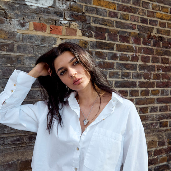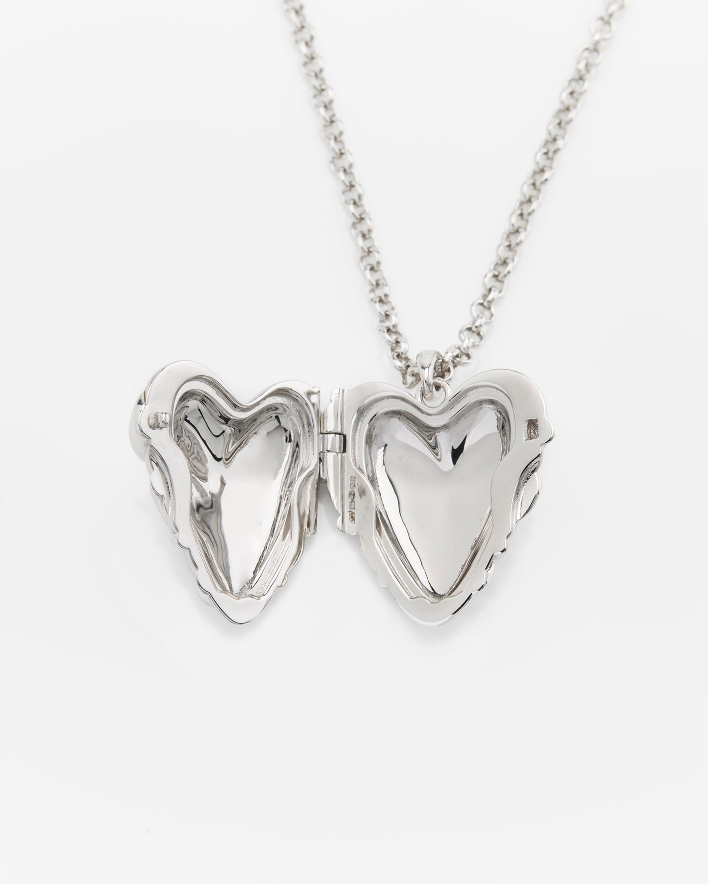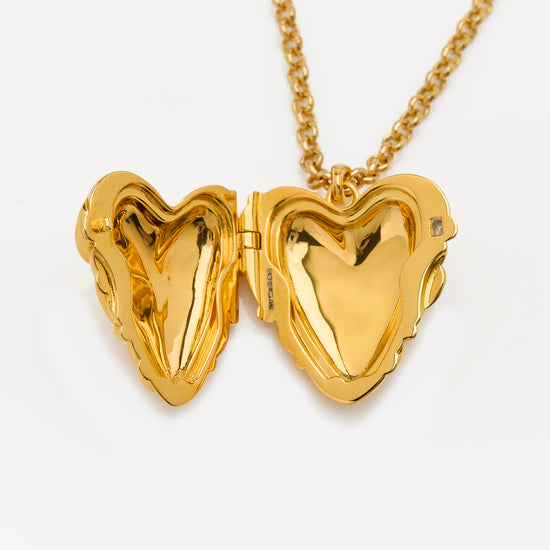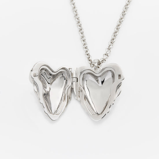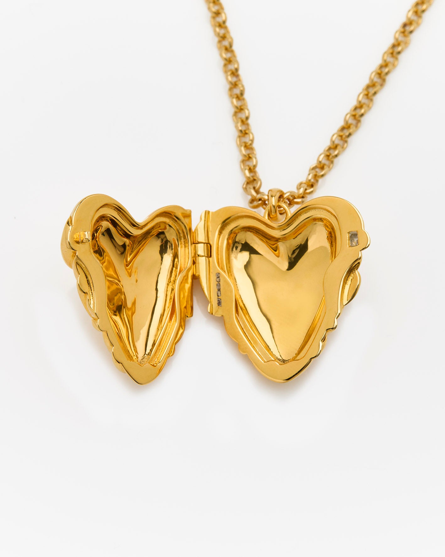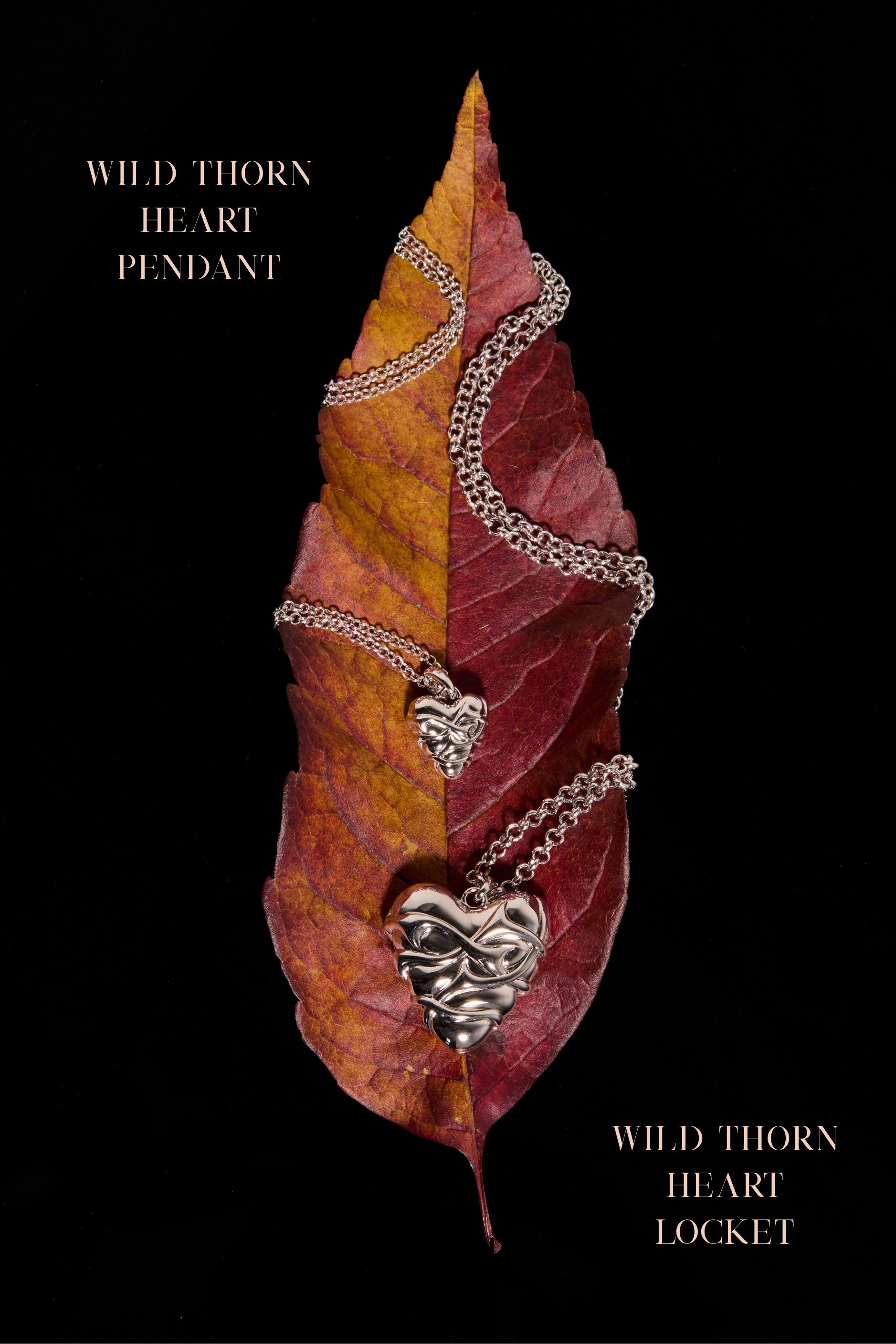 The Wild Thorn Heart Locket is a large heart-shaped necklace in 18ct gold vermeil or rhodium-plated sterling silver, captured within sculpted thorns and paired with an 18-inch belcher chain. A bold showcase piece that blends edge with elegance.