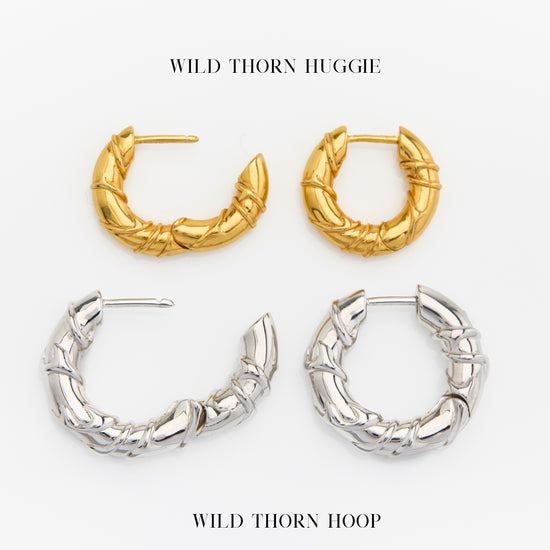The Wild Thorn Hoop is a sculpted small hoop earring, available in 18ct gold vermeil or rhodium-plated sterling silver. Inspired by untamed nature, its thorn-wrapped form balances strength and beauty.